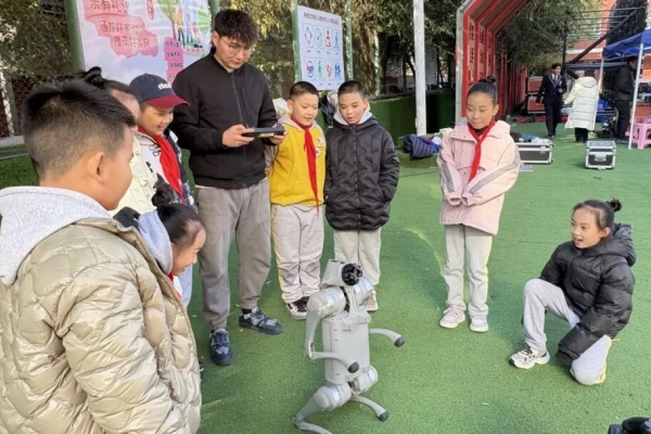 图1:乌鲁木齐市第22小学学生围观机器狗表演,充满好奇。